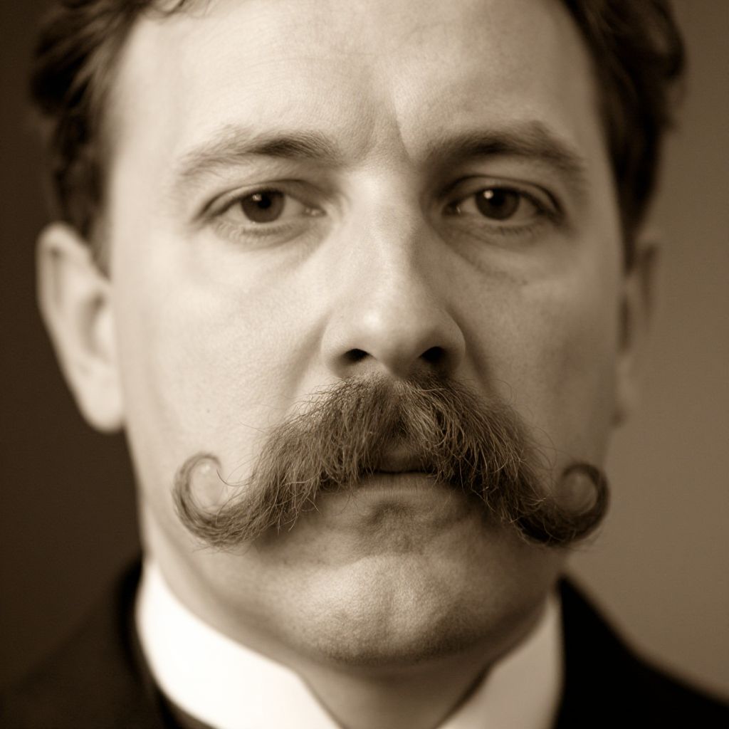 Picture of mustache, a vintage style close-up portrait of a gentleman with a thick, curled handlebar mustache, sepia tones, soft lighting highlighting the texture of the hair, elegant 1920s fashion background, detailed and nostalgic atmosphere.