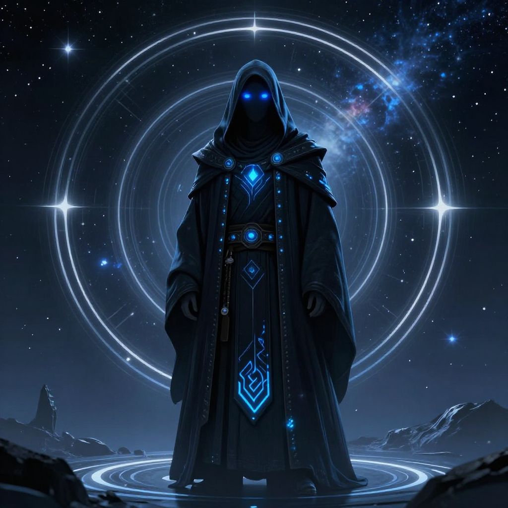 Digital art of a hooded, glowing blue-eyed figure in a dark, ornate robe, standing in a circular neon halo against a starry,