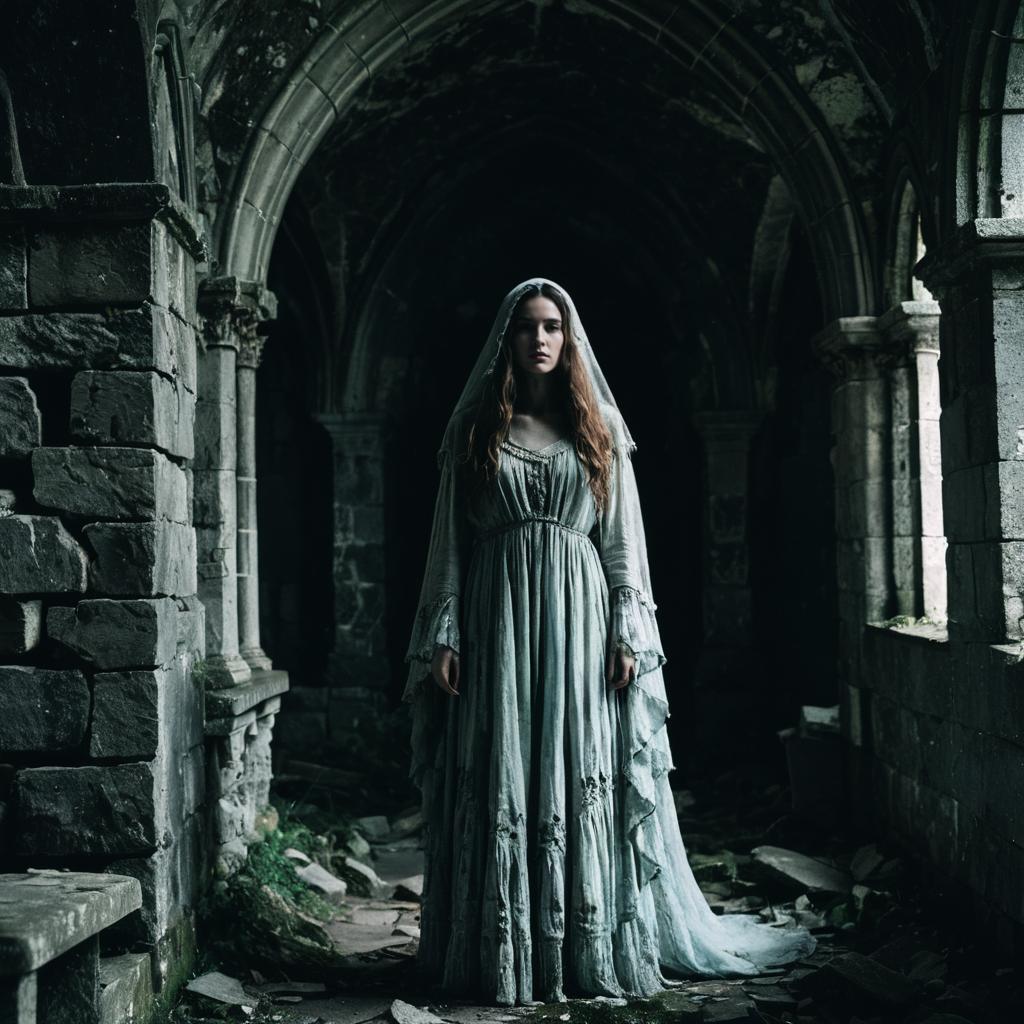 Banshee Woman in Ethereal Robes on Stormy Cliffs