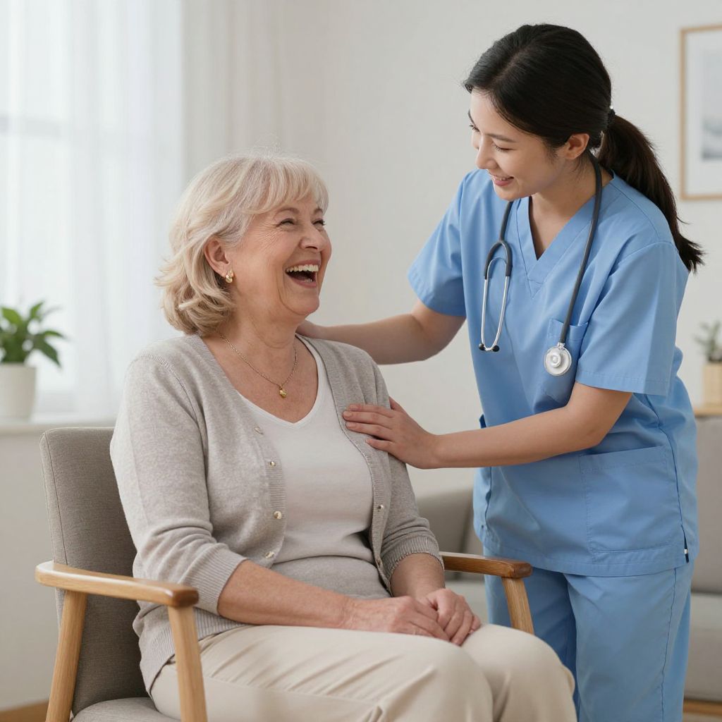 Photograph of an elderly woman with short, white hair, wearing a beige sweater and white pants, sitting in a gray armchair, laughing joyfully. A young Asian woman with black hair in a ponytail, dressed in light blue medical scrubs, stands beside her, gently placing her hand on the elderly woman's shoulder. The background is a bright, modern room with white walls, a window with sheer curtains, and a small potted plant on a white shelf. The atmosphere is warm and caring.