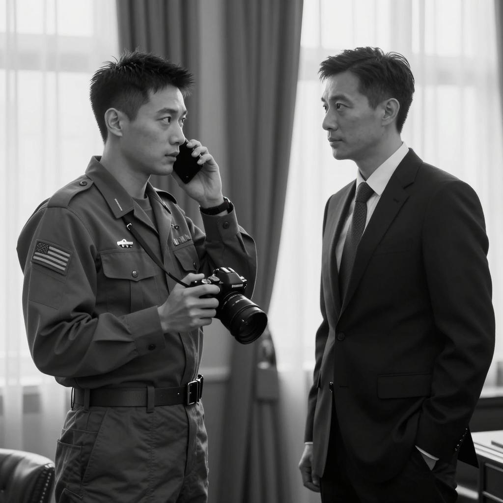 Two Asian men in formal attire are looking at a camera with flash. The man on the left, wearing a red shirt and black vest, is smiling while holding and pointing the camera. The man on the right, in a blue shirt and tie, has a concerned expression. They are indoors with a blurred background.