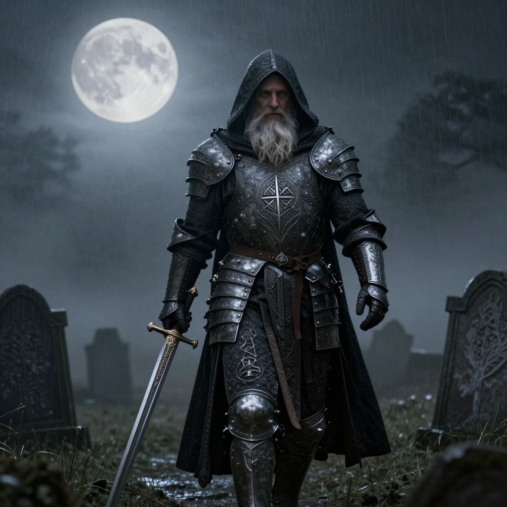 Photograph of a bearded, armored knight with a hood, holding a sword, standing in a rainy cemetery under a bright full moon.