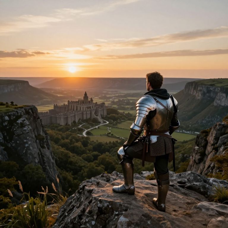 A medieval knight in shining armor stands on a rocky cliff, gazing at a sunset over a distant castle and rolling hills. Photorealistic digital art