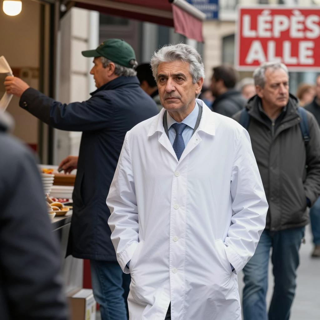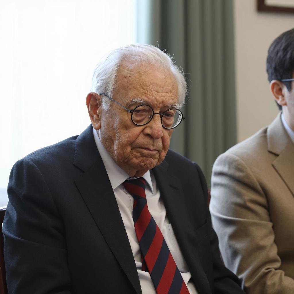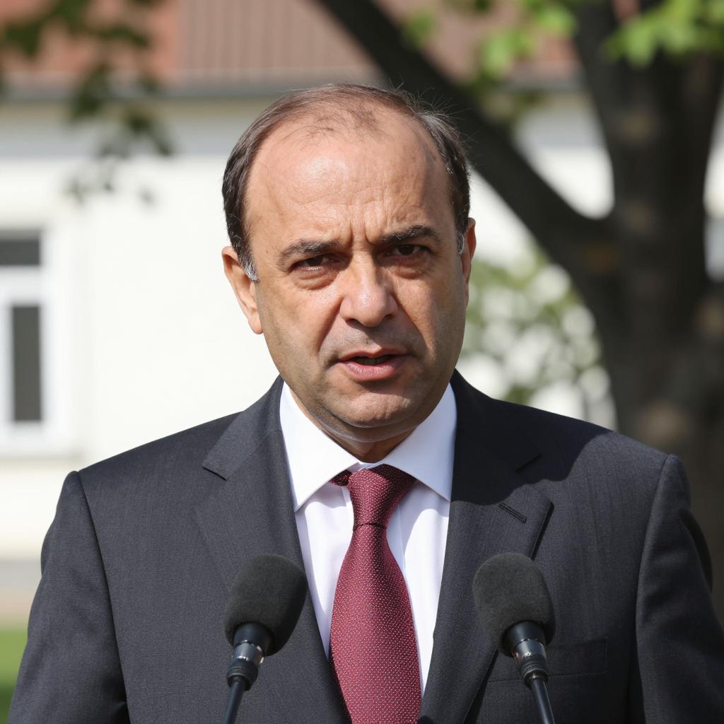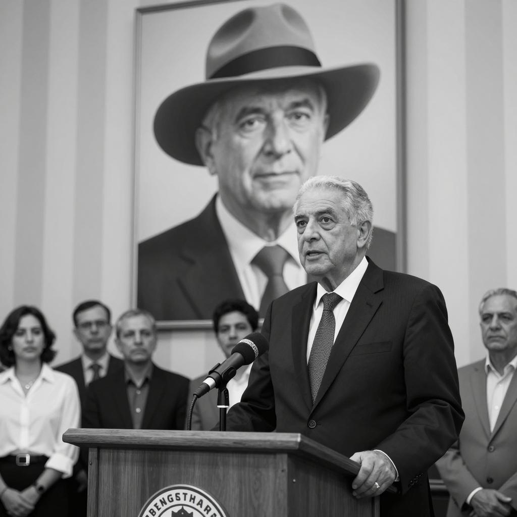 Black-and-white photograph of a political speech. Large portrait of an older man in a wide-brimmed hat on the wall. Man in suit and tie speaks at a wooden podium. Another man in a dark suit and white shirt stands behind him, looking to the left. Six people in the background, some smiling, others neutral. Striped wallpaper in the background.
