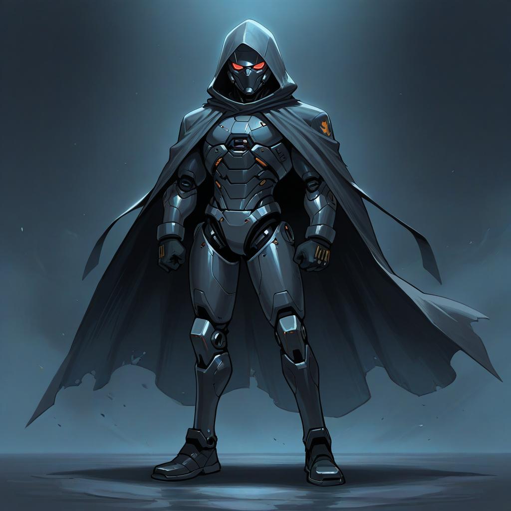 Digital artwork of a full-body futuristic cyborg standing confidently. The cyborg features sleek, black and metallic armor with intricate detailing. It wears a hooded cloak and a mask with glowing red eyes, emphasizing a mysterious and powerful presence. The figure is male, dressed in black gloves and long sleeves, set against a dark, moody background.