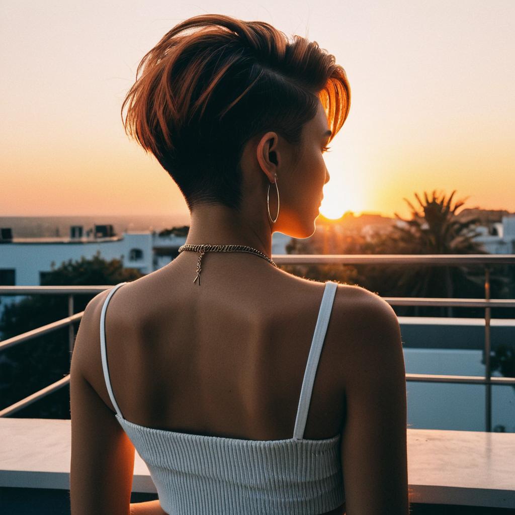 Nape Undercut hairstyle on fashion model, wearing minimal top, in outdoor terrace, captured in fashion editorial style with dramatic sunset glow.