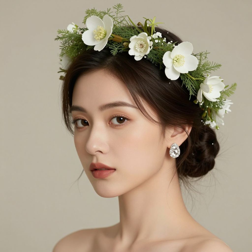 A woman adorned with an elegant Art Nouveau-style flower crown featuring delicate white blooms and green foliage, complemented by a chic updo and sparkling earrings, exudes timeless beauty against a soft, neutral backdrop.