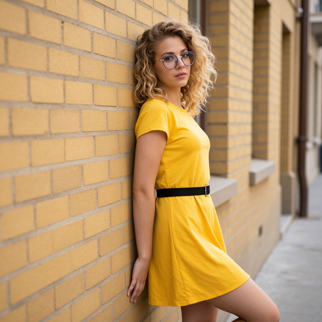 Photograph of a young woman with curly blonde hair and glasses, leaning against a yellow brick wall. She's wearing a bright yellow short-sleeve dress with a black belt, and has a confident, slightly sultry expression. The background includes more yellow brickwork and a narrow, paved alleyway. Her pose is relaxed, with one hand on the wall and the other by her side.