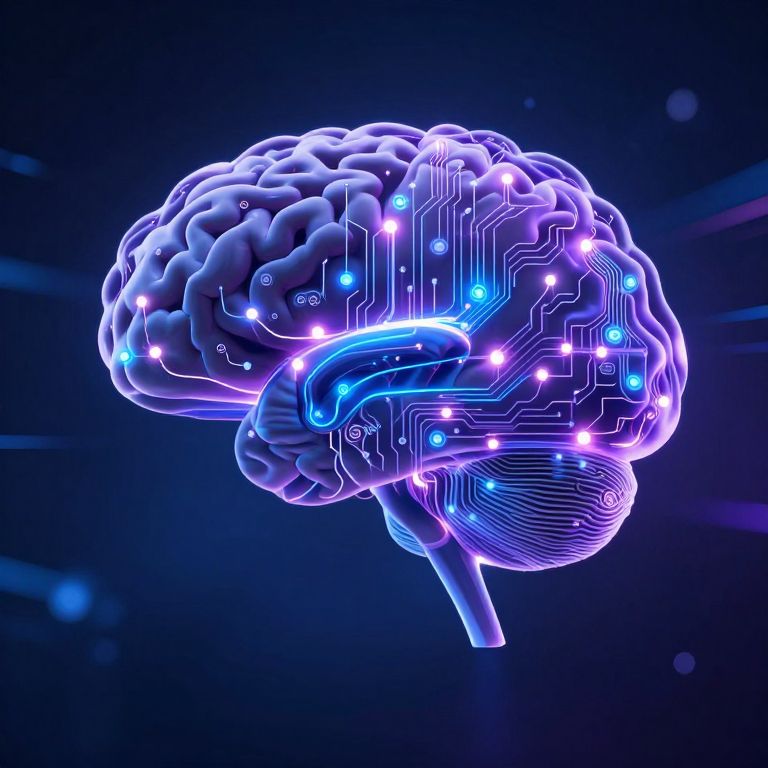 Digital CGI of a glowing, neon blue and purple brain with circuit patterns, floating against a dark, starry background.