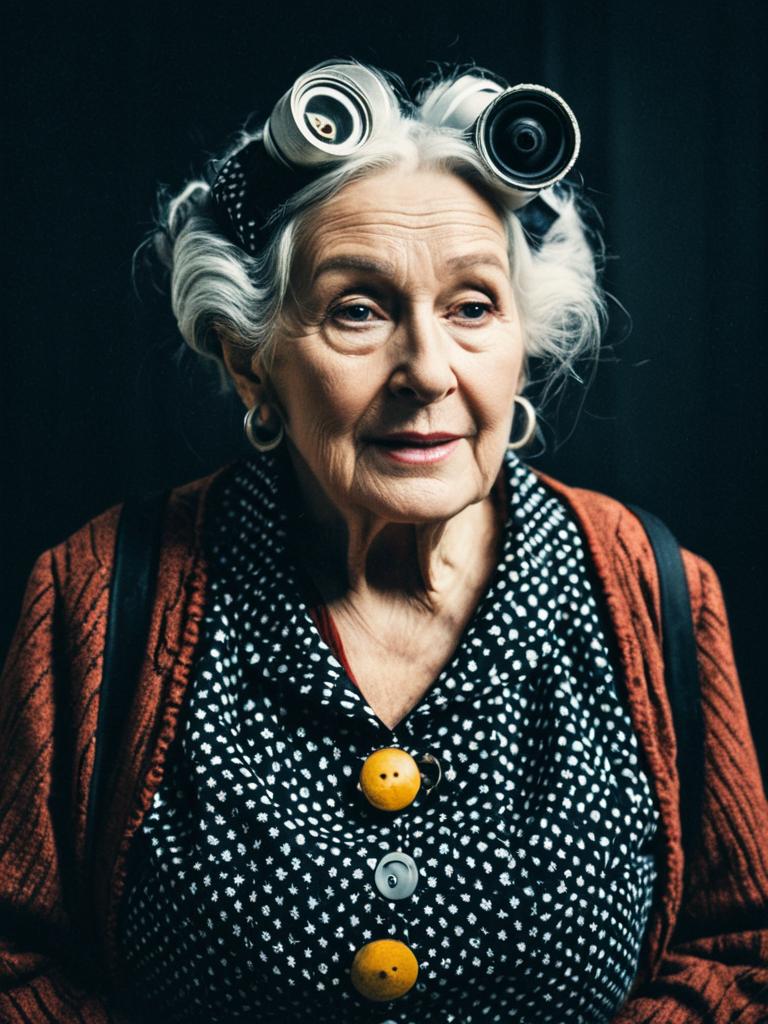 Woman in Crazy Old Lady Costume, waist-up editorial portrait, photorealistic tones