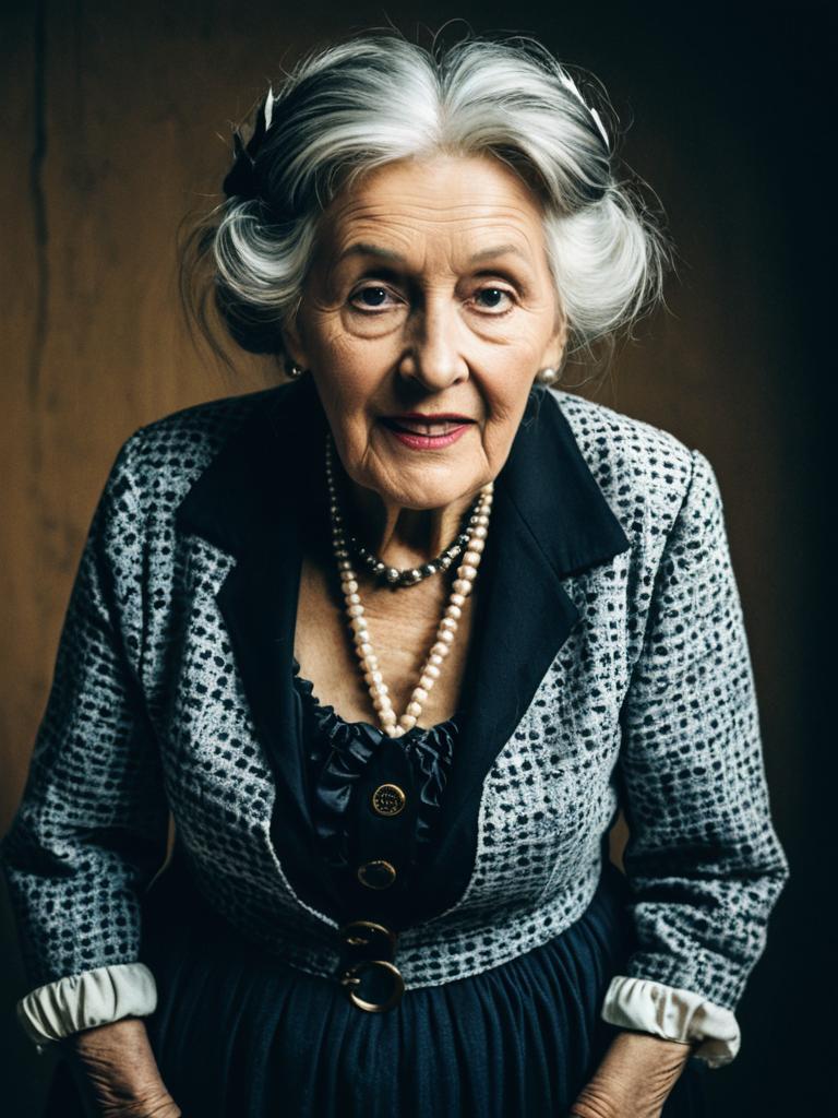 Waist-up portrait of an elderly woman with gray hair styled in vintage waves, wearing a textured gray coat over a dark teal vest with gold buttons and a black scarf with white floral patterns. The image features photorealistic tones with a dark background, highlighting the detailed facial features and expressive gaze of the woman.