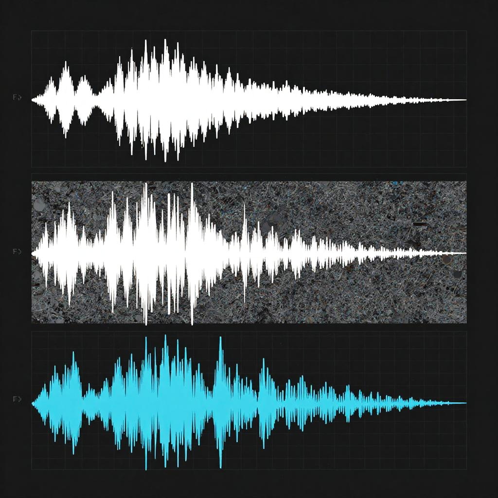 Abstract visualization of Windows audio compressor effect on sound, featuring layered waveforms, dynamic range reduction illustrated with smooth curves, set on a dark digital grid background