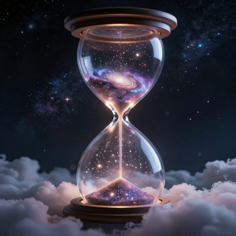 Digital artwork of a glowing hourglass filled with a cosmic galaxy, floating on fluffy clouds against a starry night sky.