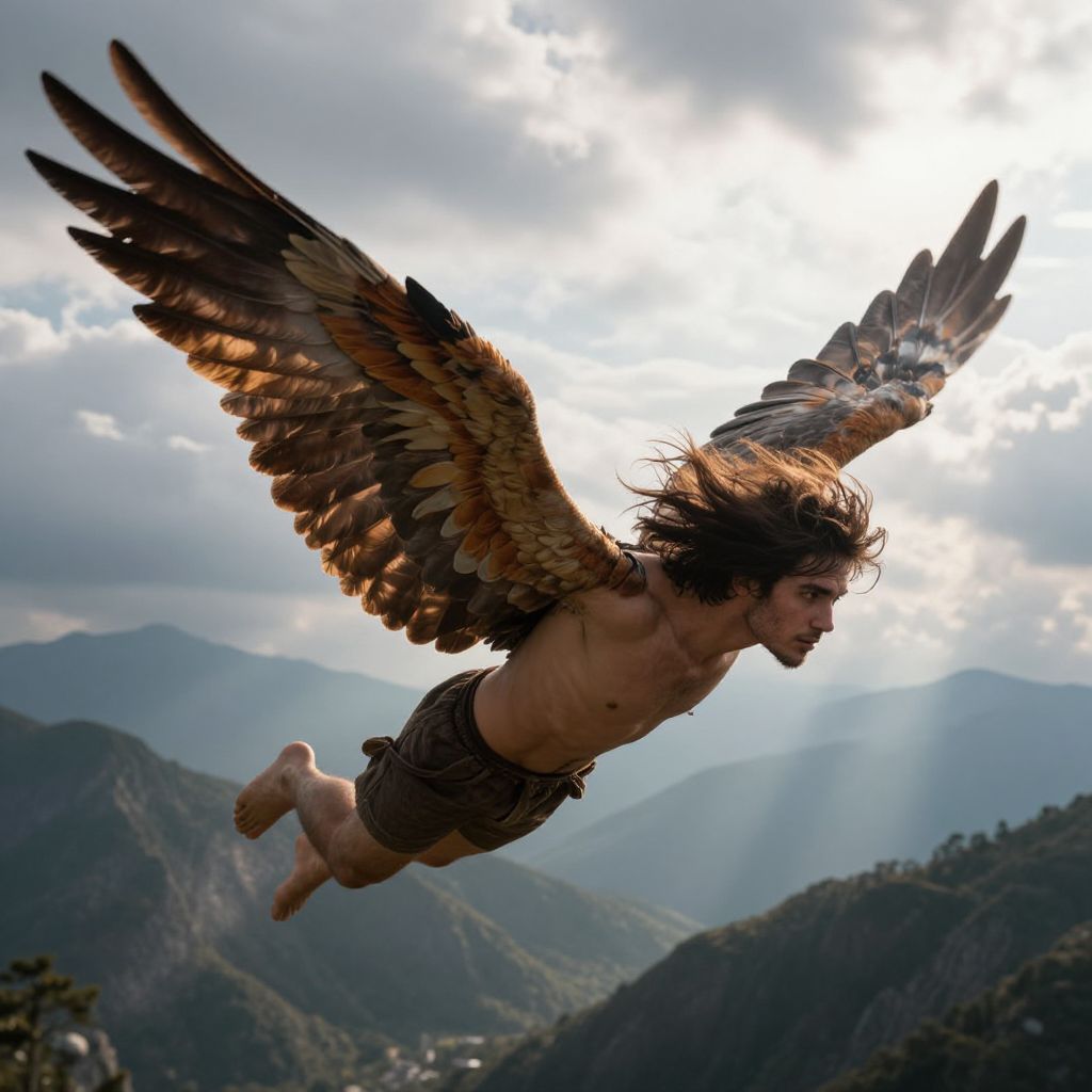 Photograph of a shirtless, long-haired man with large, brown-feathered wings flying over a mountainous landscape, sunlight breaking through clouds behind