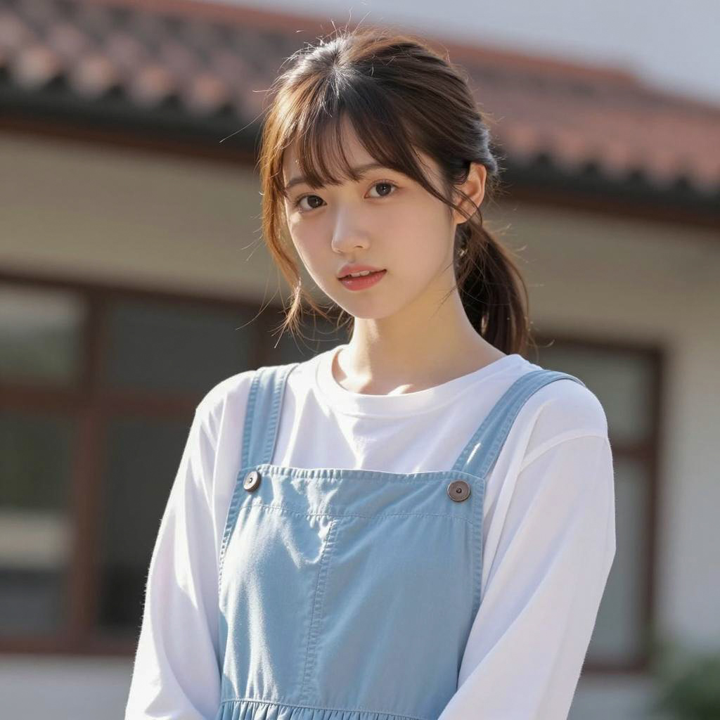 Portrait of a young Asian woman with long brown hair and bangs, wearing a traditional Japanese school uniform featuring a white shirt with a dark blue sailor collar and maroon tie. She has light skin, brown eyes, and a gentle smile, sitting indoors near a window with natural light. The background includes a window and wooden chairs, indicating a classroom setting.
