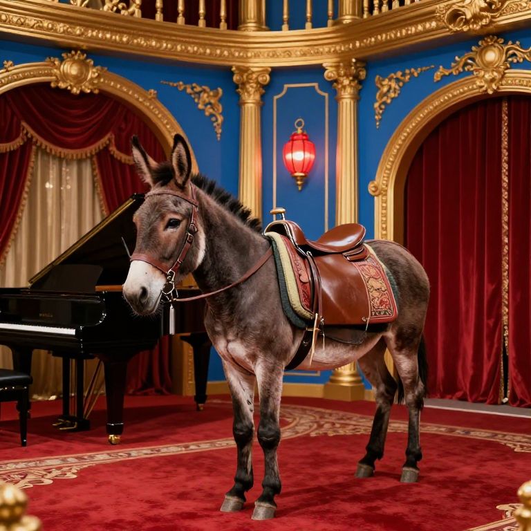 A live saddled mule stands in an ornate room with red carpets, blue walls, and gold accents, featuring a grand piano, a red lantern, and a curved archway, evoking a carnival-inspired, maximalist atmosphere.