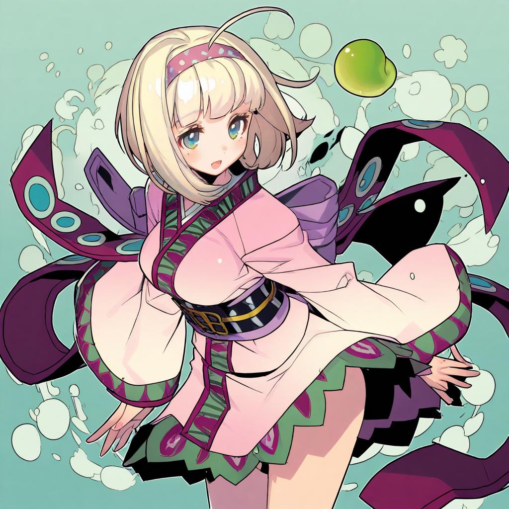 Moriyama shiemi, ao no exorcist, 1girl, green eyes, blonde hair, short hair, ahoge, hairband, kimono, by artist fengmo, animagine