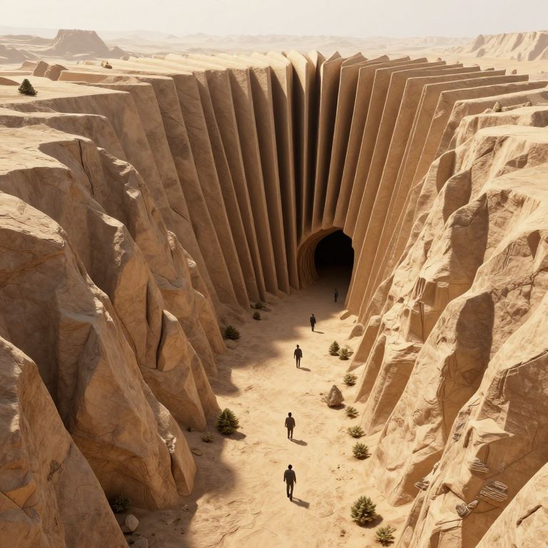 Photorealistic CGI of a massive, towering desert canyon with steep, sandy rock walls and a dark, shadowy entrance. Three tiny, distant figures