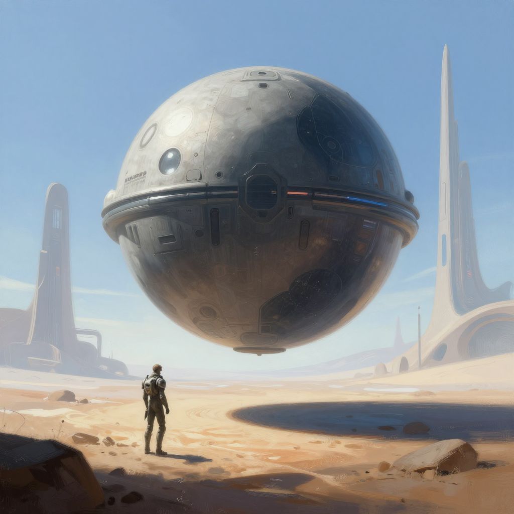 Digital painting of a futuristic cybernetic landscape featuring a massive, spherical hovering vessel casting a shadow over a barren terrain. A lone figure in advanced armor or a spacesuit stands near the vessel. The background includes abstract, towering structures under a clear sky, exuding a sci-fi atmosphere reminiscent of the styles of Linda Bergkvist, Ash Thorp, and Simon Stålenhag.
