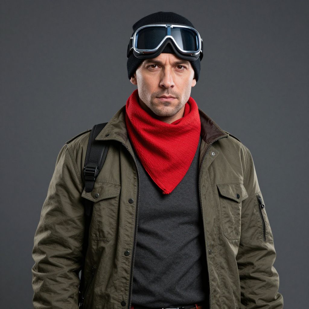 Rugged Fashion Costume, man with a red scarf and goggles on his head