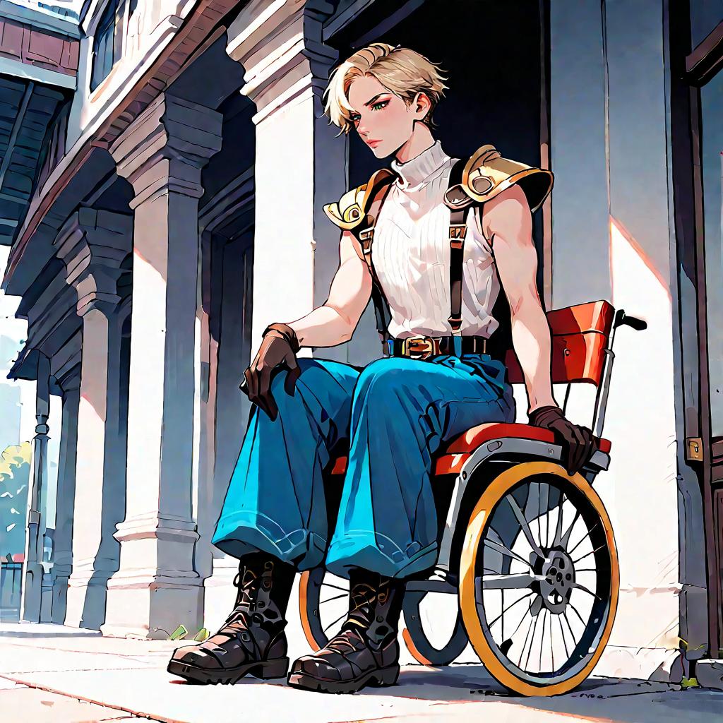 Score_9, score_8_up, score_7_up, source_anime, 1boy, wheelchair, sitting, full body, indoors, defCloud, blonde hair, single earring, suspenders, shoulder armor, sleeveless turtleneck, belt, baggy pants, blue pants, gloves, boots
