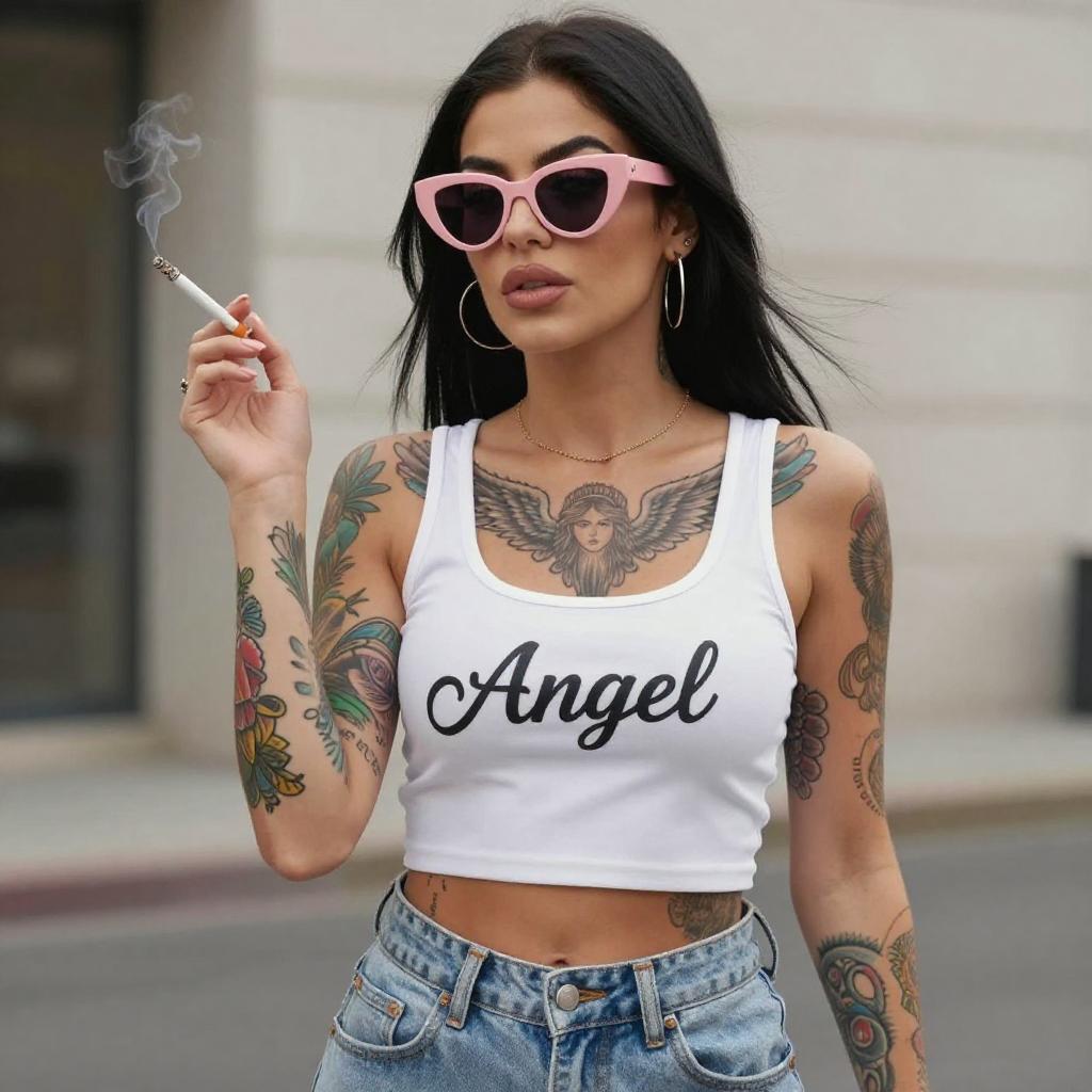 Photograph of a tattooed woman with long black hair, wearing pink sunglasses, a white crop top with "Angel" in cursive, and blue jeans. She holds a cigarette in her right hand, displaying colorful sleeve tattoos and a detailed chest tattoo. She stands against a blurred urban background.