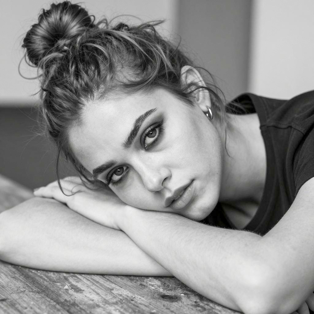 Black-and-white photo of a woman with light skin and dark, wavy hair in a messy bun. She rests her head on her arms, which are crossed over a rough-ured surface. Her eyebrows are thick, eyes are smoky with dark eyeliner, and lips are slightly parted. She wears a dark top. Her expression is neutral and intense. One ear has a small hoop earring. The background is blurred.