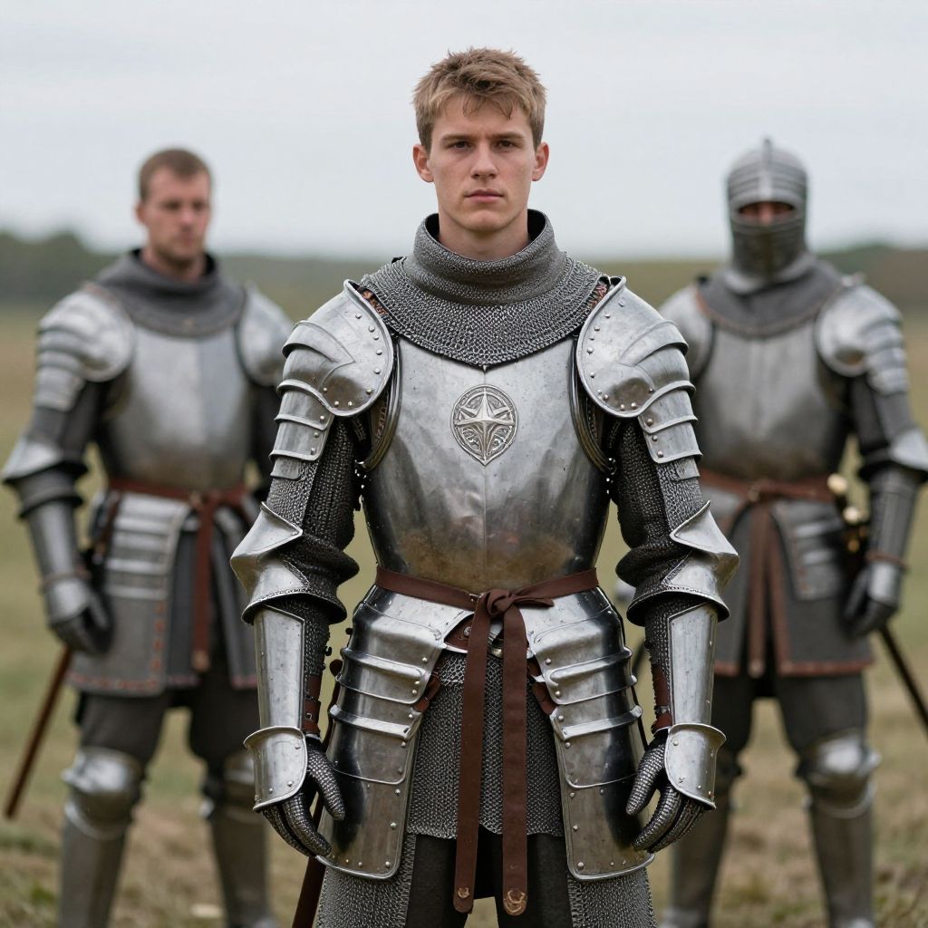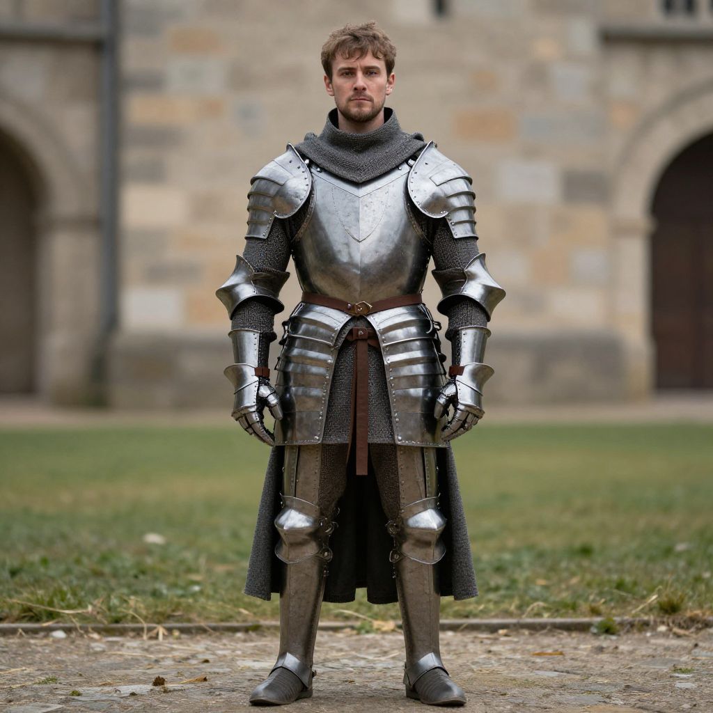 Photograph of a young Caucasian man in shiny silver medieval armor with a black cloak, standing on grass in front of a stone castle. Serious expression,