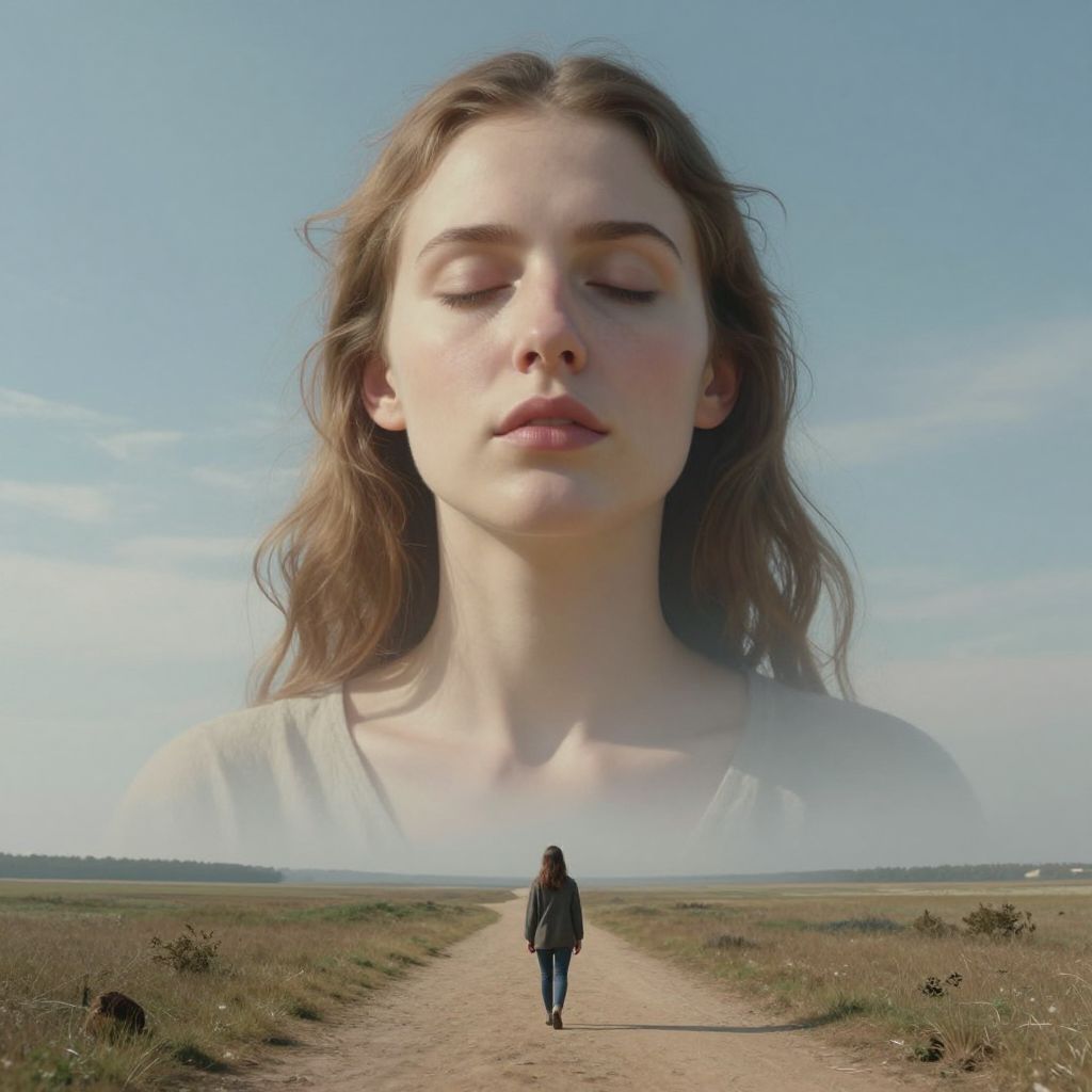 A surreal digital artwork featuring a giant, floating portrait of a serene woman with closed eyes, looming over a vast, open landscape where a solitary figure walks down a dirt path, evoking a dreamlike atmosphere with ethereal lighting and a blend of photorealistic and impressionistic elements.