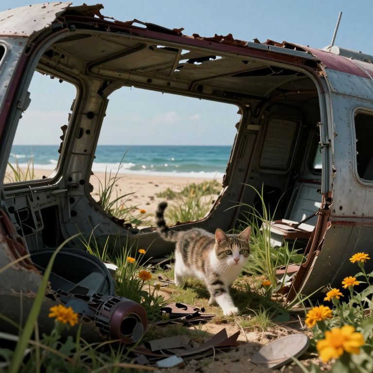 Award-winning photography, photo of a cat inside a destroyed badly damaged space ship in a beautiful beach, Cats running around:1, Broken windows, broken body, spare parts scattered nearby, ) Grass and flowers grow around it, Sunny summer day, ocean, Calm and beautiful, Detailed art, many details, cute, adorable, fairytale, storybook detailed illustration, cinematic, ultra highly detailed, beautiful details, vibrant colors, complex background, fine art, professional poster art, bold lines, aesthetic and beauty, astounding details, high depth of field, f/4, framing, breakthrough, collodion process, soft particles, ageless atmosphere, maroon and marigold colors, dark, low-key, jen