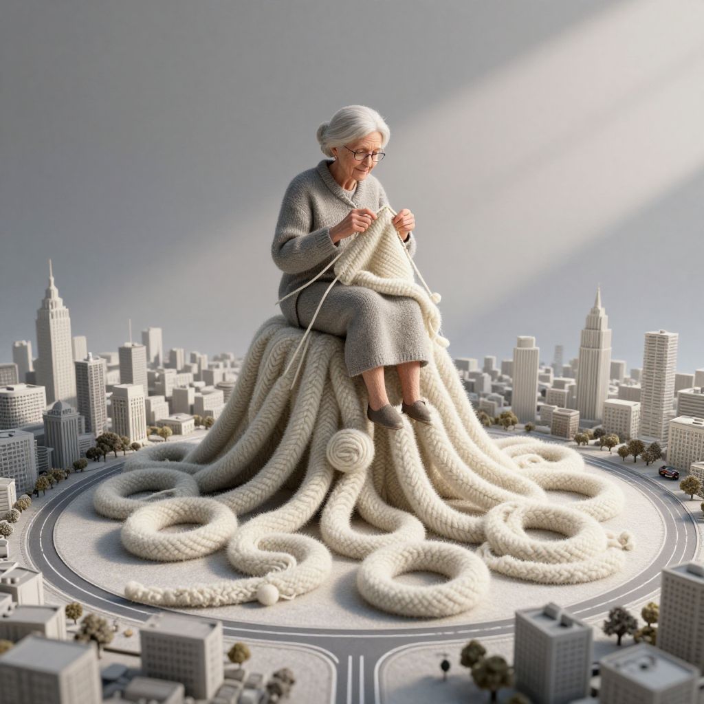 In a surreal 3D-rendered scene, an elderly woman sits serenely atop a miniature cityscape, knitting colossal woolen loops that cascade into intricate patterns, casting dynamic shadows that sculpt the landscape below, as unseen architects transform her creative designs into roads and buildings.