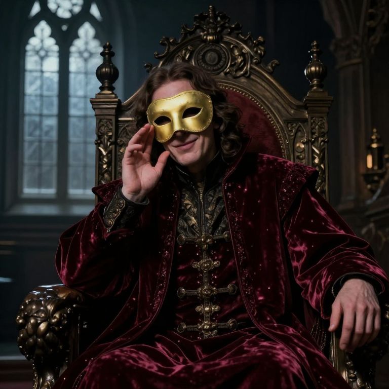 Mysterious man in ornate, dark velvet robe and gold masquerade mask, seated on elaborate wooden throne in dimly lit, gothic-style