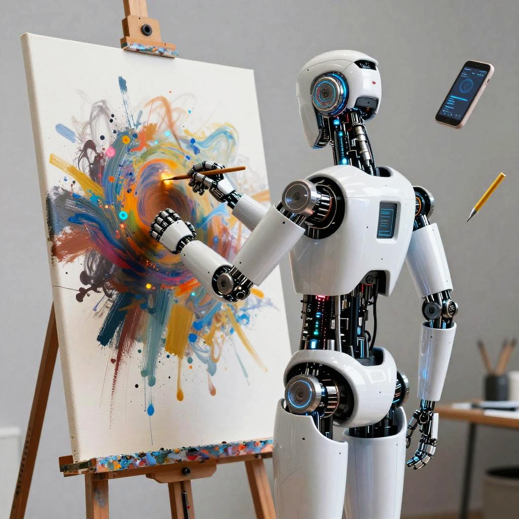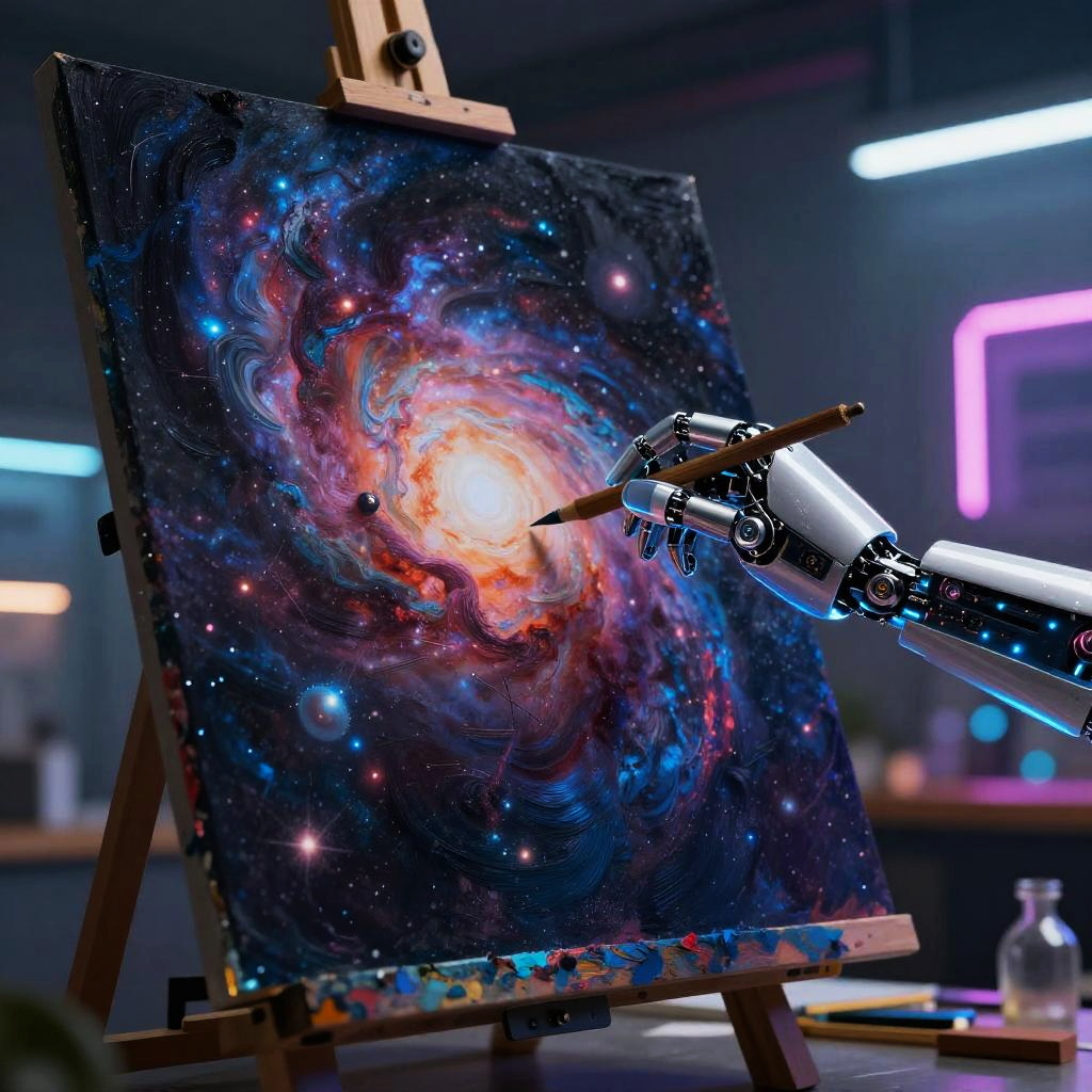 Art style generator in action, robotic arm painting on canvas with morphing fluid colors, vivid gradient transitions from oil paint to watercolor and ink sketch styles, surreal creative atmosphere, detailed and layered composition