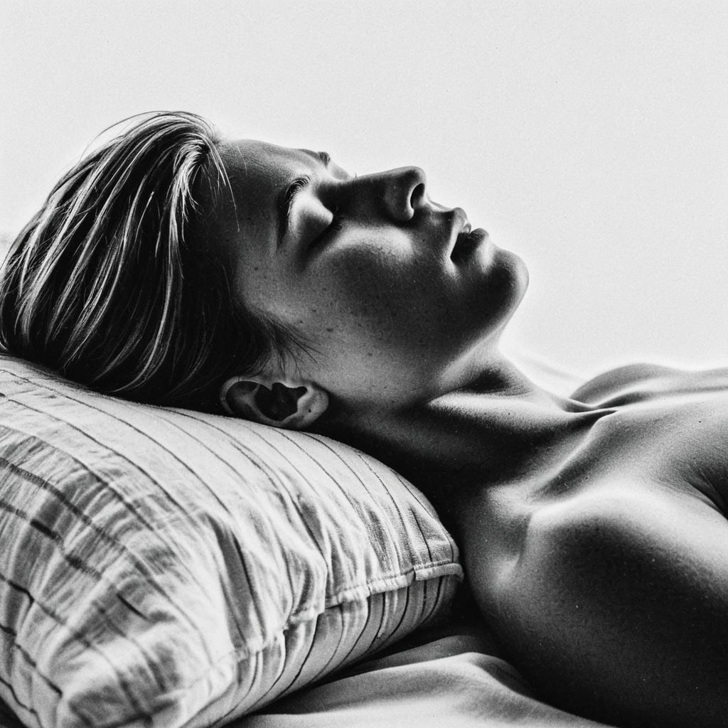 Black and white photo of a shirtless teenage boy lying on a bed with closed eyes, appearing calm and relaxed. The image emphasizes muscle tone and facial features, highlighting a peaceful moment of stress relief and relaxation.