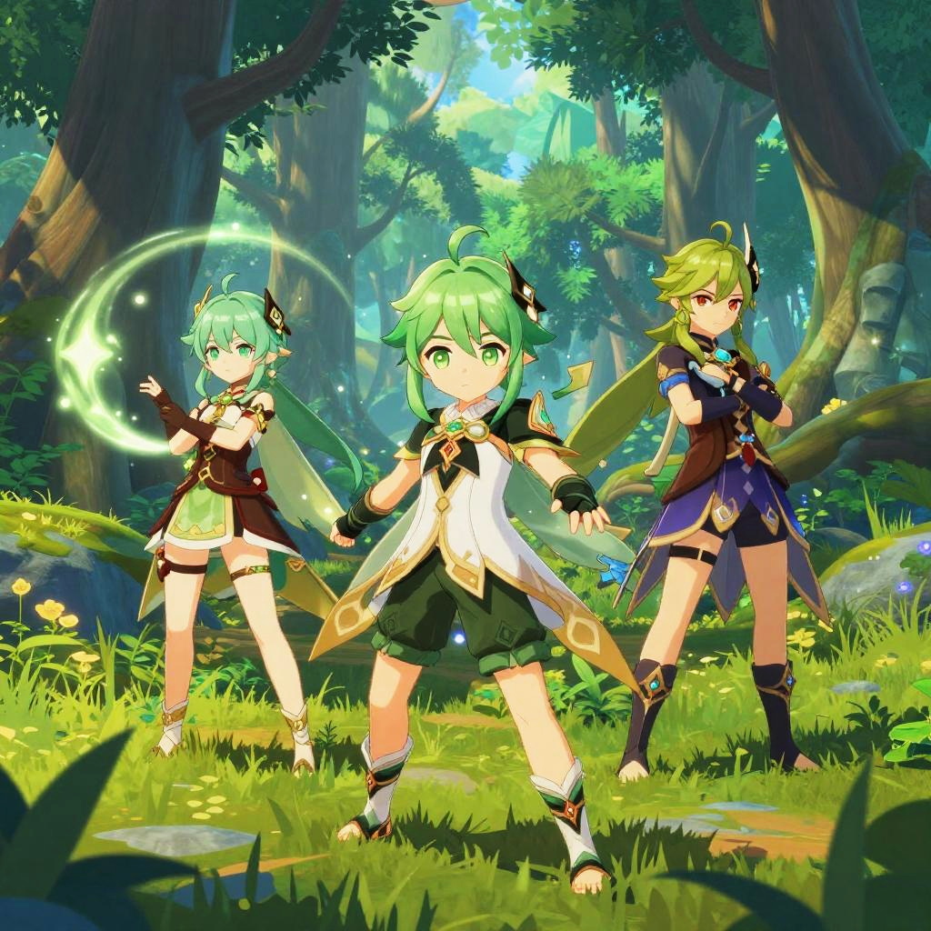 Green haired Genshin characters depicted in a lush fantasy forest, intricate anime style, vibrant colors, detailed costumes with natural elements, dynamic poses with magical effects swirling around, soft ambient lighting highlighting their unique features.