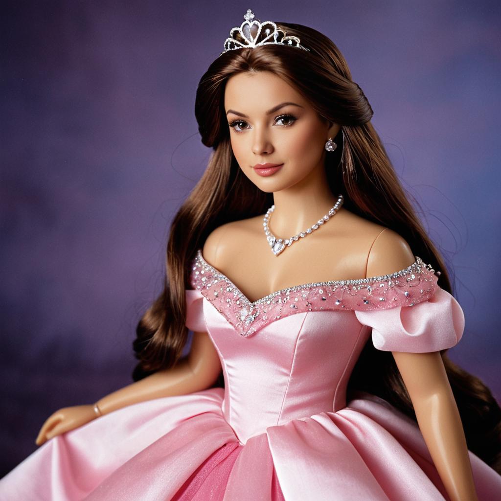 Portrait of a young woman with long blonde hair wearing a shiny pink princess dress adorned with decorative jewels and a matching floral necklace. She has a silver tiara with a pink heart-shaped gem and is posing against a dark brown textured background. The outfit includes puffy short sleeves and a voluminous skirt.