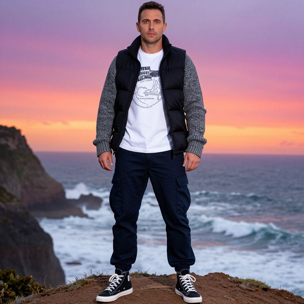 A man, dark blue cargo pants, fitted black puffer vest, graphic white t-shirt, chunky gray knit cardigan, versatile black high-top sneakers, coastal cliffside, crashing waves below, vibrant sunset hues, candid shot, relaxed expression Man has masculine face and piercing eyes