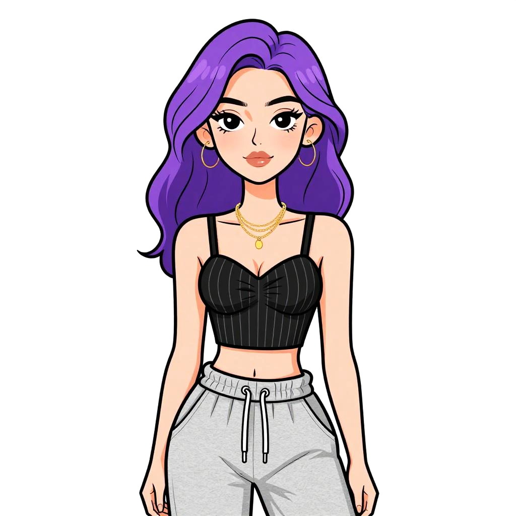 Woman with pretty face and pretty hair. Woman, casual streetwear, black pinstripe crop top with sweetheart neckline and thin straps, gray cotton sweatpants with elastic waist, layered gold necklaces, plain white background. --sref 1461