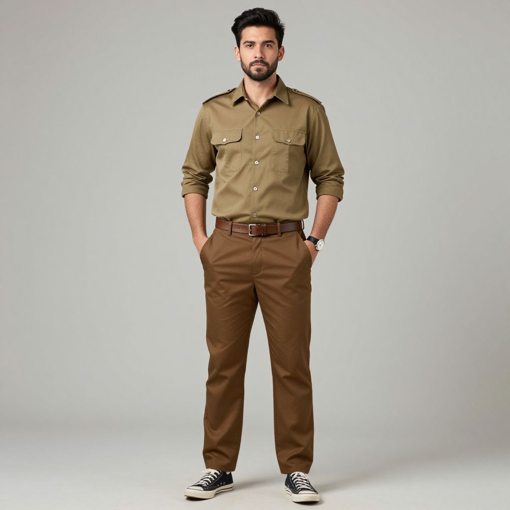"khaki outfit man costume, 1boy, male focus, solo, facial hair, watch, wristwatch, shirt, beard, mustache, full body, pants, belt, shoes, brown pants, standing, hands in pockets, black hair, pocket, sneakers, realistic Realistic photo of casual sexy person with pretty face"