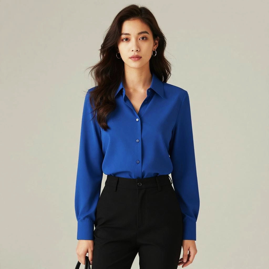 Photograph of a stylish woman with long, wavy dark brown hair, wearing a vivid royal blue blouse with long sleeves and black high-waisted pants. She has a fair skin tone, subtle makeup, and small hoop earrings. She's holding a black handbag in her right hand, and standing against a softly lit, neutral-toned background. Her expression is calm and confident.