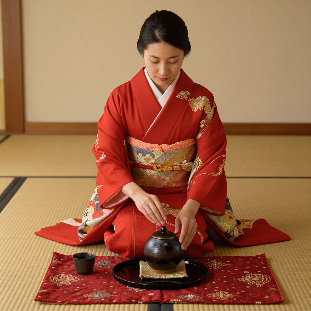 Seated gracefully on a tatami mat, a woman dressed in a vibrant red kimono adorned with gold embroidery performs a traditional tea ceremony, her hands poised over a dark ceramic teapot resting on a black tray placed atop a richly patterned red cloth.