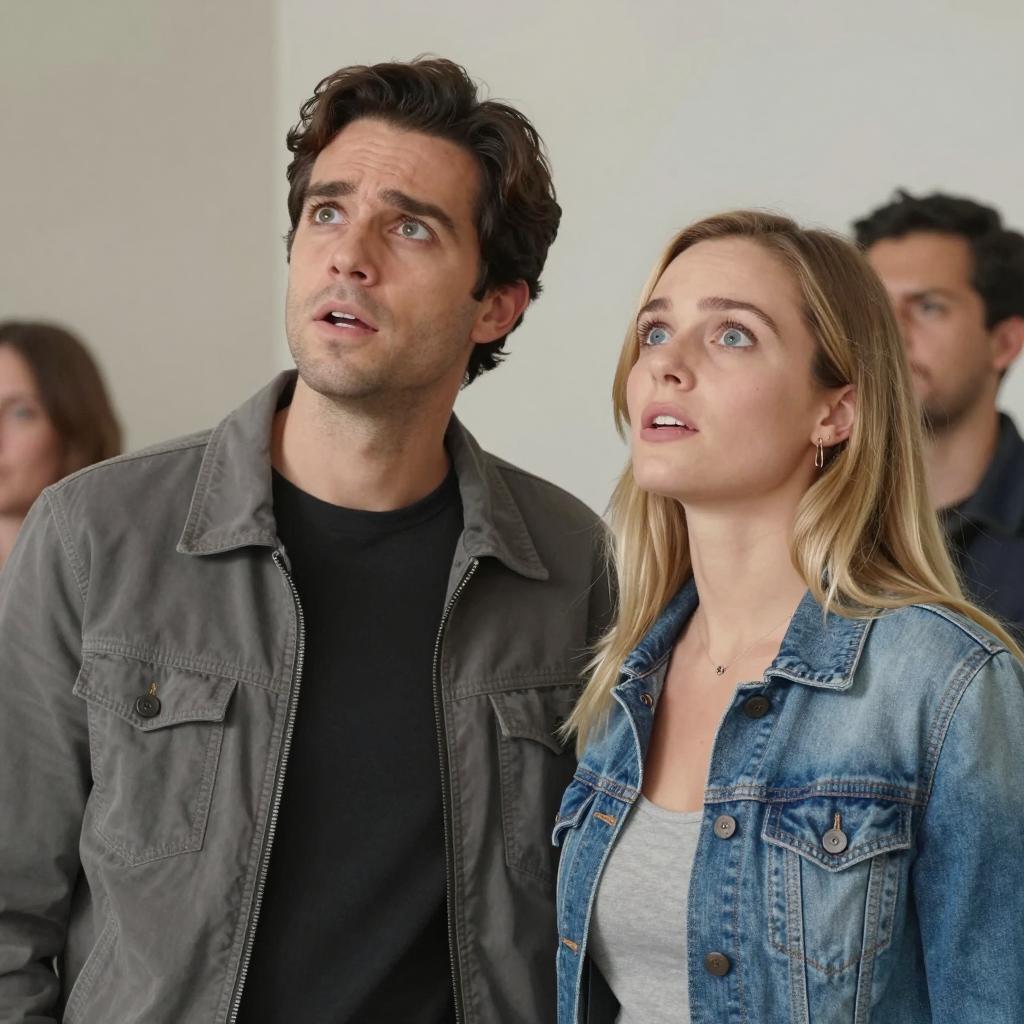 A photograph of a man and woman in a bedroom. The man with wet, dark brown hair, shirtless, holds a white towel over his chest, looking serious. The woman with blonde hair, wearing a black tank top, looks surprised. They are sitting on a bed with a wooden headboard and a lamp on the right. The background includes a light blue wall with a red star. The man wears a black watch on his left wrist. Both are in the center of the image, facing the camera.