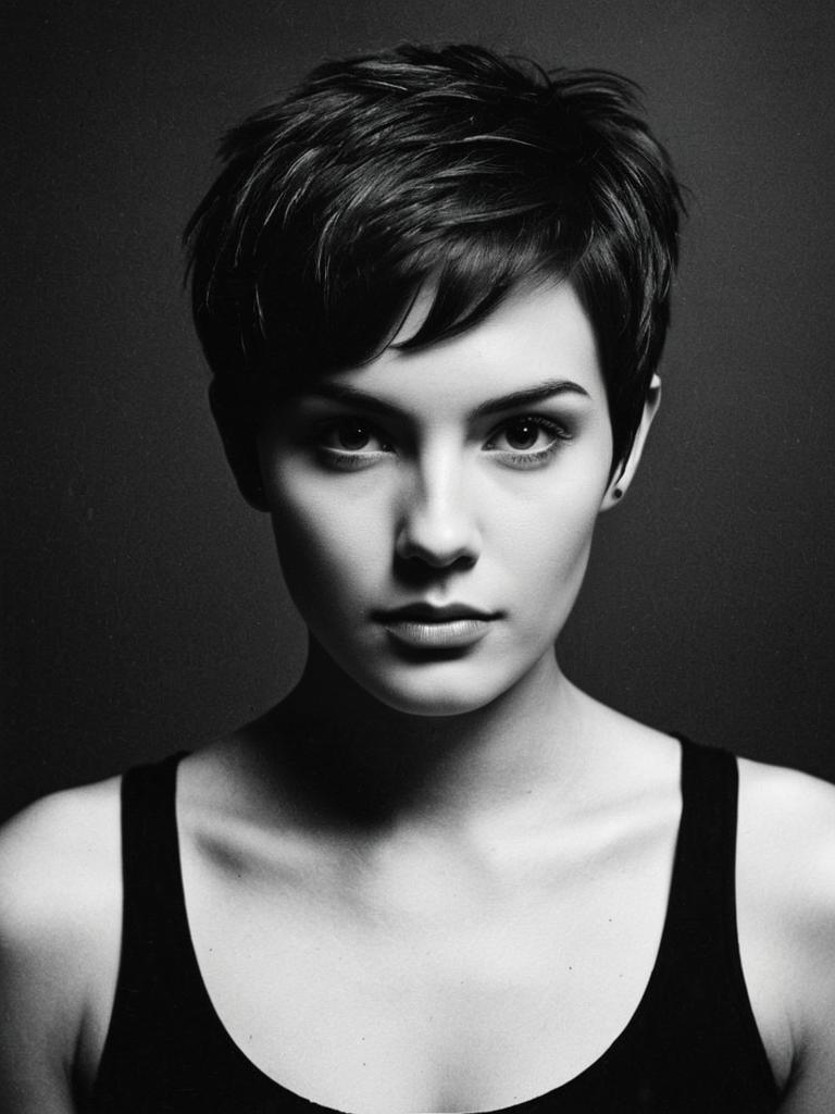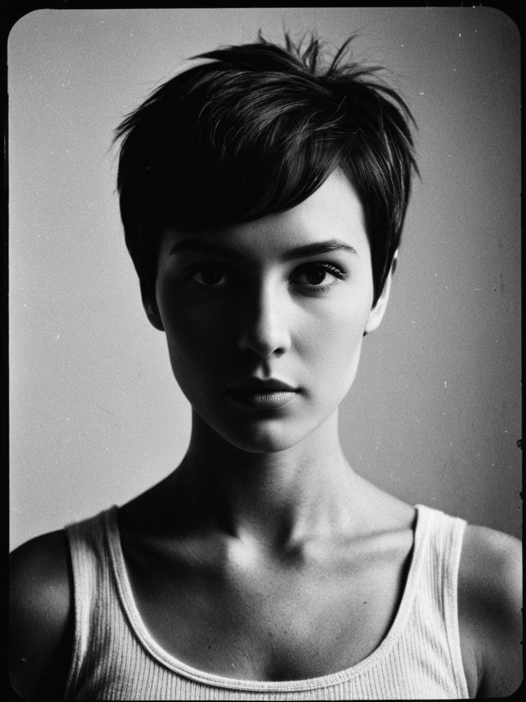 Black and white waist-up portrait of a young woman with a short pixie haircut. She wears a sleeveless ribbed tank top and looks directly at the camera with a neutral expression. The photo has a cinematic realism style with soft lighting and a plain background.