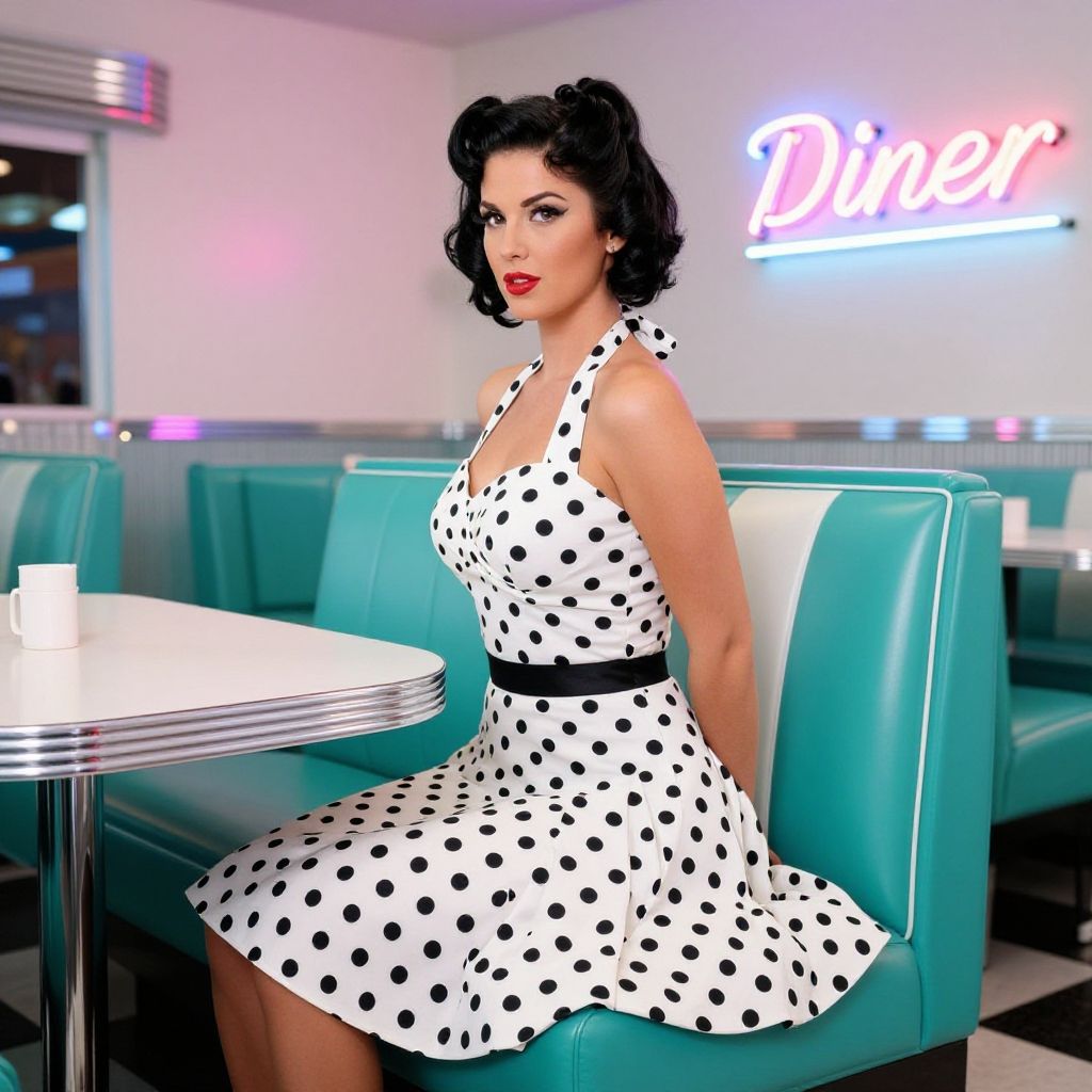 Latina boobs in vintage pin-up style, retro hairstyle, playful pose, bright red lipstick, polka dot outfit, warm sunlight glow, classic 1950s vibe, detailed textures, nostalgic atmosphere