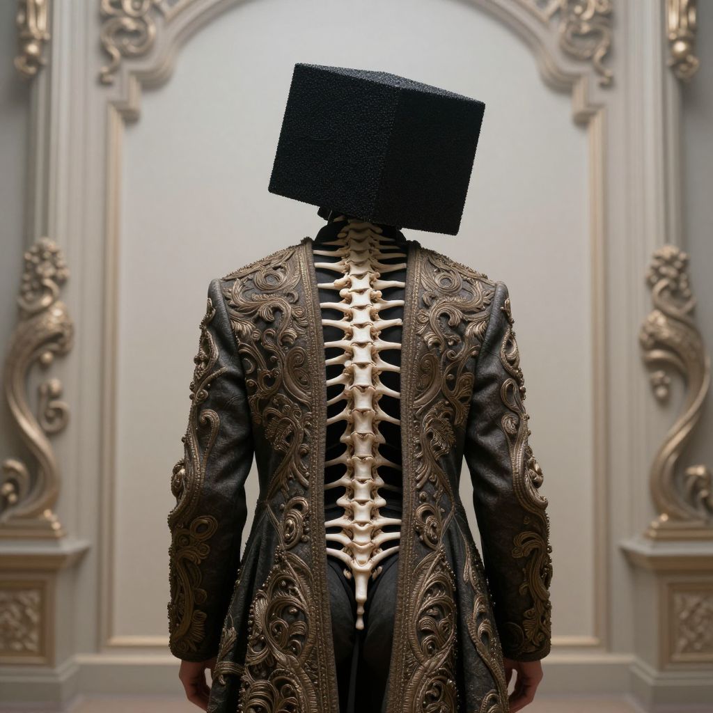 Back view of man standing inside ornate template, haze, exposed spinal column, black biomechanical cube helmet, grain, iris van herpen, jean delville, james jean, ornate garments