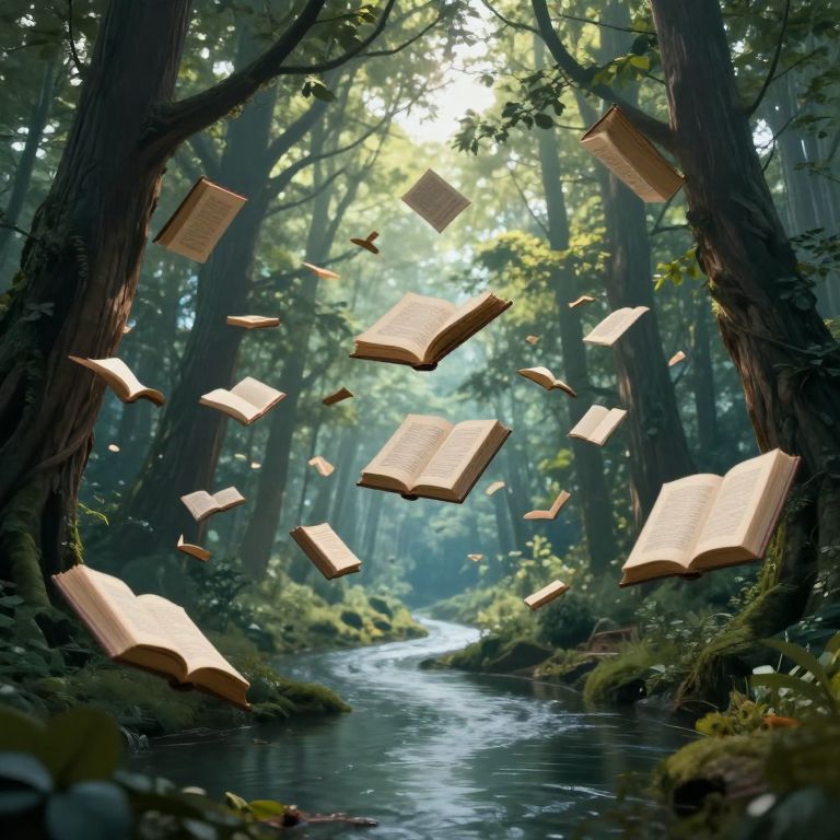Books float ethereally through a mystical forest, suspended between ancient trees and a tranquil river, defying gravity in a dreamlike dance of knowledge and wonder.