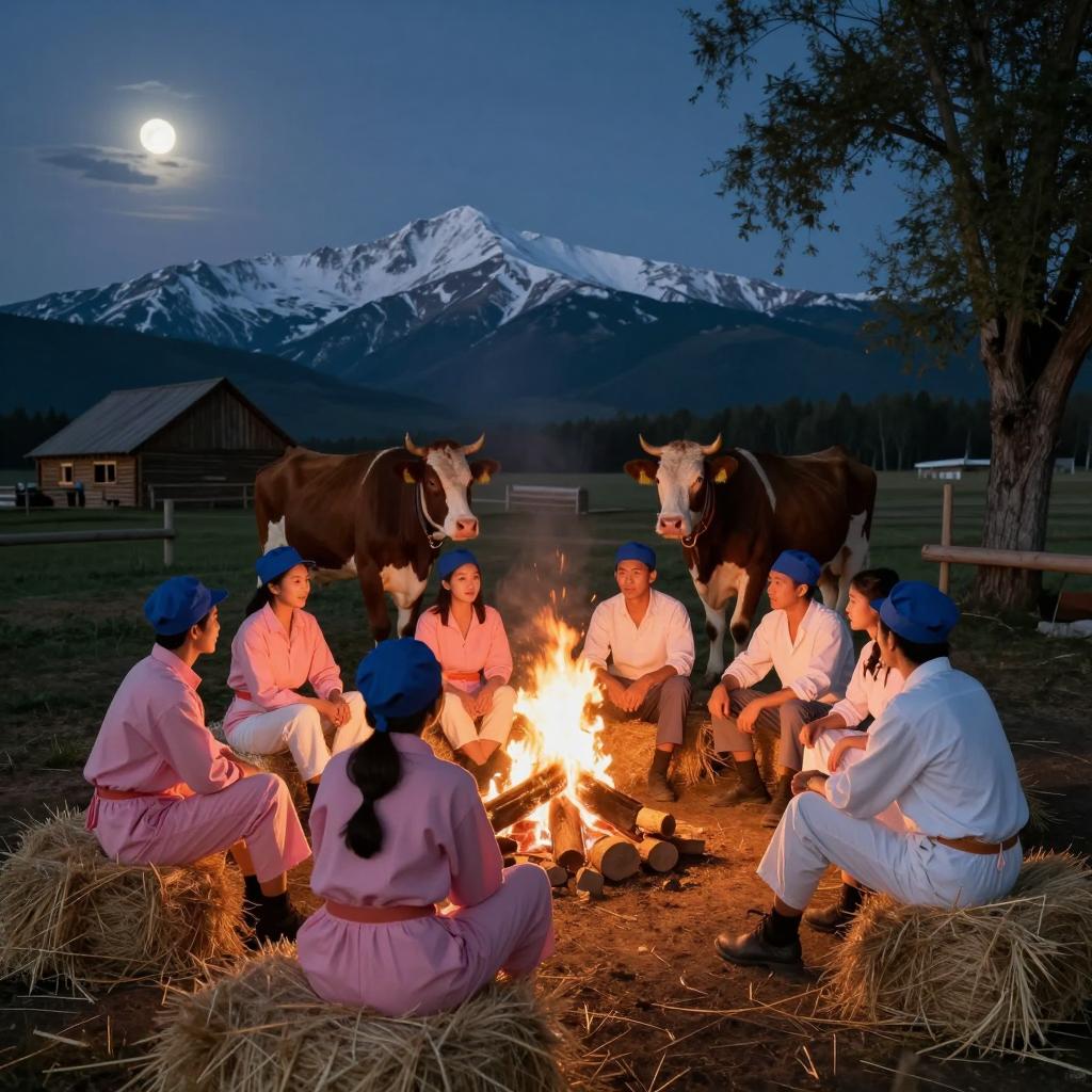 Nighttime photograph. Six people, three men, three women, seated on hay bales around a glowing fire. Two cows stand between them. People wear pink and white clothes, blue hats. Snow-capped mountains, barn, and field in background. Dark sky with moonlight. People facing forward, looking at fire. One cow looks at camera. Hay and straw on ground. Tree on right.