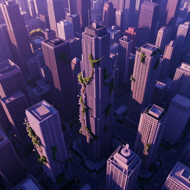Craft an image depicting a fantastical cityscape where skyscrapers transform into abstract geometric forms, intertwined with natural elements like vines and blossoms sprouting from their surfaces. This aerial view should showcase the intricate details of this peculiar landscape, emphasizing both its ordered structures and chaotic elements. Employ a rich color palette featuring deep purples and blues to instill feelings of enigma and amazement, as sunlight elongates shadows across the distorted architecture, creating an emotional gradient that varies throughout the scene and enriches the surreal ambiance.