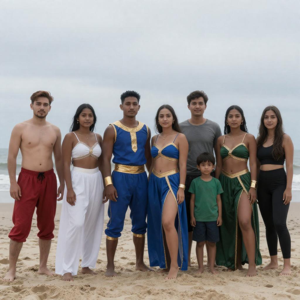 Photograph of a group of eight people standing on a sandy beach with a cloudy sky in the background. They wear various costumes: a shirtless man in red, a woman in a white dress, a man in blue with gold accents, a woman in a blue and gold dress, a woman in green armor, a child in green, a man in gray, and a woman in dark clothing.