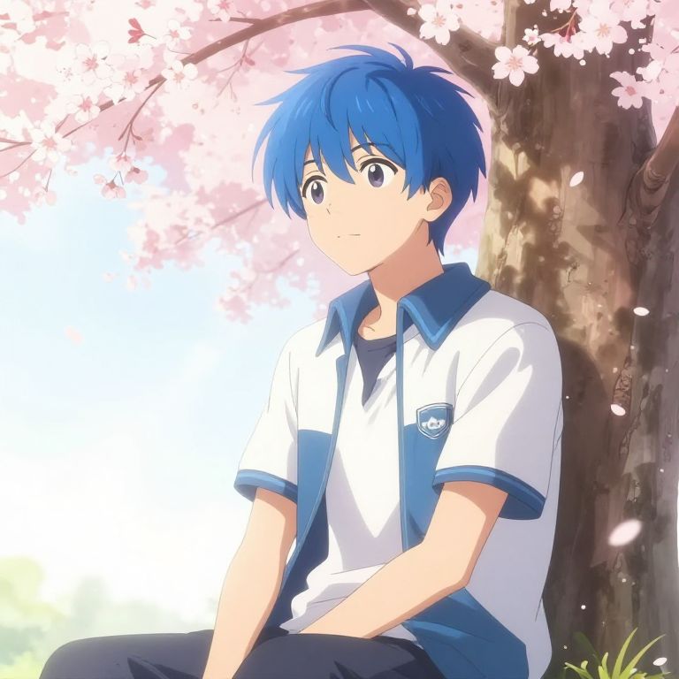Blue haired anime guys relaxing in a cozy modern apartment, soft natural light from large windows, casual stylish clothing, minimalist decor with warm colors, slice-of-life anime vibe capturing peaceful and intimate moments.